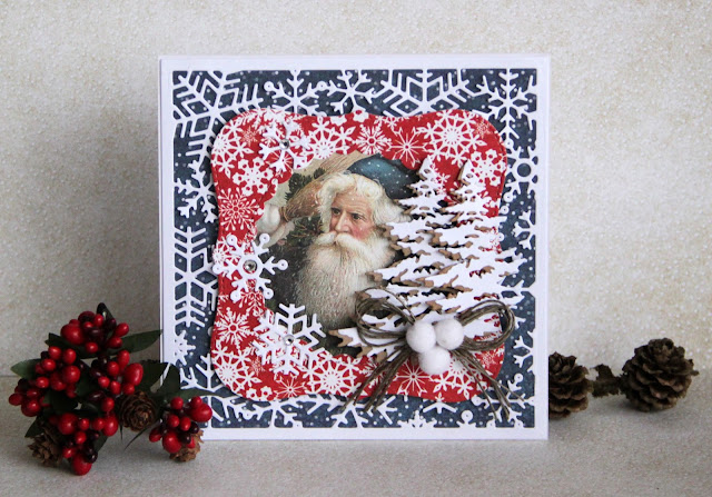 Tutaj znowu zastosowałam wykrojnik Memory Box Pine Needlle Twigs do wykonania tła. Ramkę